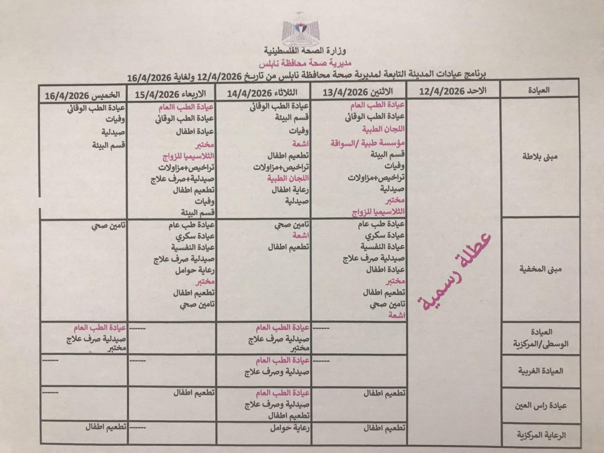 برنامج دوام عيادات الصحة نابلسيات برنامج عيادات المدينة التابعه لمديرية صحة محافظة نابلس 14 أبريل 2026 آخر تحديث: 15 أبريل 2026 1 دقائق للقراءة 0 كلمة 2 مشاهدة التصنيفات: برنامج دوام عيادات الصحة نابلسيات مشاركة المقال: فيسبوك تويتر واتساب نسخ الرابط